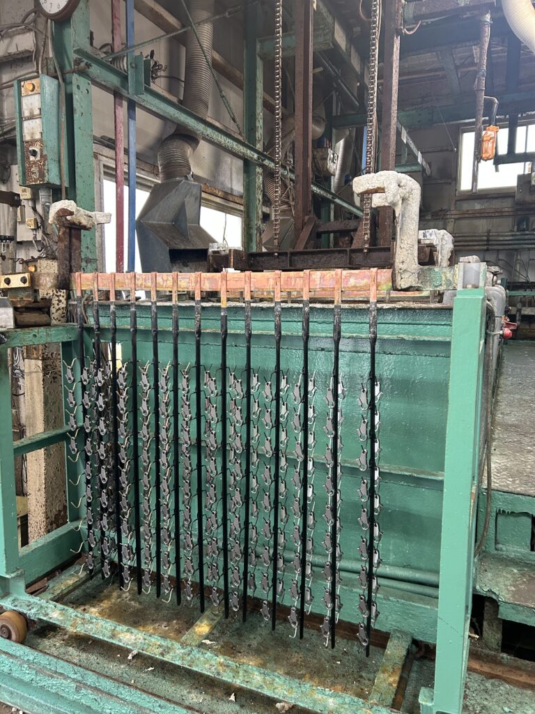治具に部品を掛けて、メッキをコーティングする方法です。